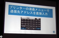 もう1つの新しい機能として、スキャンしたデータを手軽に送れる「スキャン to 電子メール」機能を搭載していて、プリンターのタッチスクリーンからアドレスを指定して送信するだけで、ファクスを送信するのと同じ感覚・操作で、指定のEメールアドレスに送ることができると紹介していました。