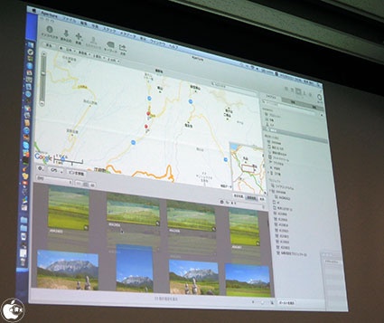 Aperture 3はUIが美しく、作業がしやすいのが特徴で、MacBook Pro (Retina Mid 2012)を使いながら実デモを行い、メタデータを用いたキーワード検索が便利だと説明していました。