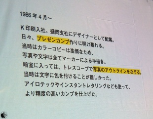 1986年にK印刷会社でプレゼンカンプを作るのに明け暮れていた時代があり、写真や文字は全てマーカーによる手描きし、暗室に入っては、トレースコープで写真のアウトラインをなぞるという作業がとても大変だったと話してました。