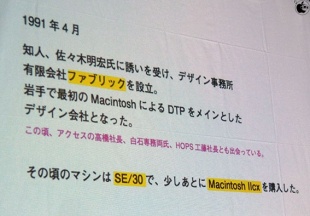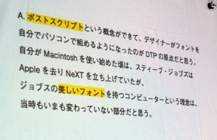 PostScriptという概念が出来て、デザイナーがフォントを自分で組めるようになったのがDTPの原点だと思うと話し、Steve Jobs氏の美しいフォントを持つコンピューターという理念は、当時も今も変わっていないと部分だと思うと話してました。