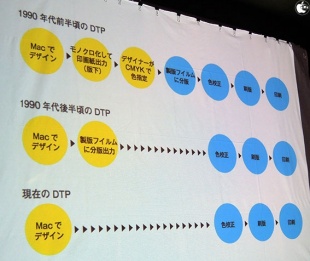 1990年代前半頃のDTP、1990年代後半頃のDTP、現在のDTPとの行程の違いを年代をおって説明していました。