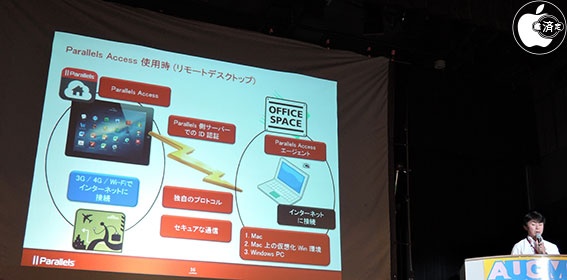 また、リモートアクセスツール「Parallels Access 2.5.1」で、東京にあるMacBook Pro上のアプリケーションを操作するデモを行なっていました。