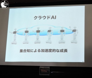 続いて、Pepperを紹介し、感情エンジンとクラウドAIの2つのテクノロジーを使用していて、集合知による加速度的な成長する仕組みだそうです。