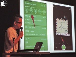 PFUのScanSnapがあればこしたことはないが、いきなりは高いと思う人は、AUGM特価で無料のiPhone/iPadアプリ「Evernote」のカメラ機能を利用すると良いとデモを交えて紹介していました。