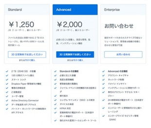 ・Standard(1ユーザーあたり月額1,250円、5ユーザー以上):高度なストレージ、共有、共同作業ツールが必要なチーム向け