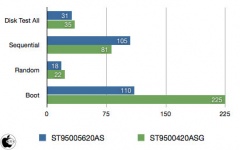 なお、詳しいデータは、Xbenchサイト上にアップしてありあます。赤が「ST9500420ASG」、青が「ST95005620AS」となります。なお、計測にあたって、データーは、ディスクユーティリティの復元を使用し、クローンシステムを使用しています。