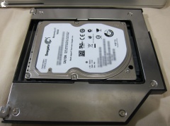 OptiBay Hard DriveユニットにHDを搭載します。ST95005620ASの実測値の厚みは、9.55mmで、SATAコネクタとの微妙な高さの差がありますが、ちゃんと装着出来ました。底面からHDをしっかり固定するため、OptiBay Hard Driveキット付属のネジで留めます。