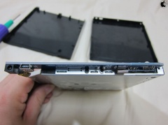 また、取り外した光学式ドライブから、右側のネジ穴ブラケットを外し、OptiBay Hard Driveユニット側に移植します。この時使用するネジは、OptiBay Hard Driveキットに付属するネジを使い、オリジナルのネジは、無くさないように、光学式ドライブの元のネジ穴に留めておきましょう。