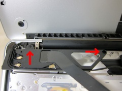 光学式ドライブ上を斜めに走るAirMac/Bluetoothケーブルを外し、AirMac/Bluetoothケーブルマウントの2ヶ所のネジを外します。
