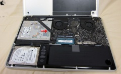 MacBook Pro (15-inch, Mid 2010)の裏フタを精密ドライバでネジを外して開けます。ここで、手前のハードディスクを取り外して、ST95005620ASに換装することも出来ますが、ほぼ使わない光学式ドライブを、HDに変えて、ダブルドライブ化して利用価値を上げることにしました。