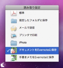 なお、読取り設定の保存先が、デフォルトで、PDFファイルでEvernoteに送信となっています。
