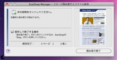 Mac側では、ScanSnap Managerで、イメージ読み取りデータが蓄えられ、読み取り終了ボタンをクリックするか、ScanSnap S1100本体のScan/Stopボタンを押すと、読み取りが終了し、割り当てられたアプリケーションに転送されます。