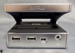 ドックの背面には、USB 2.0ハブポート x2、USB mini Bポート、外部電源端子が用意されています。
