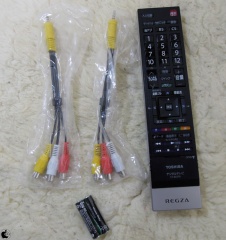 付属品は、リモコンと、薄型化の影響なのか、通常のビデオ入力端子ではなく、ピンジャック端子から通常のビデオ端子に変換するためのケーブルが2本付属します。
