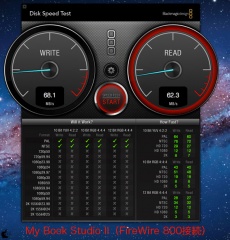 同じドライブ構成で「My Book Studio II」をFireWire 800接続で使用して速度チェックを行ってみたところ、転送速度結果は「Read:68MB/s、Write:62MB/s」でした。