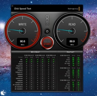 一応、Blackmagic Disk Speed Testでベンチマークを計測してみたところ「Read:89MB/s、Write:90MB/s」オーバーという結果でした。