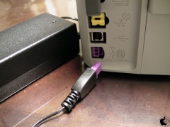 プリンターの電源は、大きめだけど軽いACアダプタを繋げる外部電源方式です。また、かなり細い電源ケーブルが採用されています。
