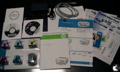 本体と一緒に添付されているのは、ドライバインストールCD、大きめだけど軽いACアダプタ、USBケーブル、バンドルソフト、マニュアル類、HP Viveraインクなどです。