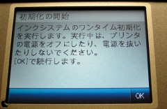 初回時に、インクシステムのワンタイム初期化(約4分)が実行されますが、この時、同梱されているインクカートリッジ以外を使用すると、同梱インクカートリッジ以外が装着されていますとアラートが表示されます。