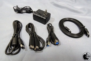 付属品として、小型のACアダプタに加え、USB 3.0ケーブル、FireWire 800ケーブル、FireWire 400ケーブル、eSATAケーブルが同梱されています。