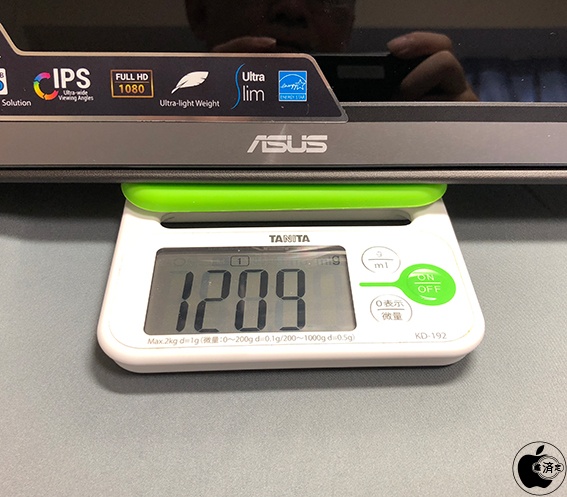 ASUS MB16AC本体、スリーブケース、USB-Cケーブル全てで重さを量ったところ1,209gでした。