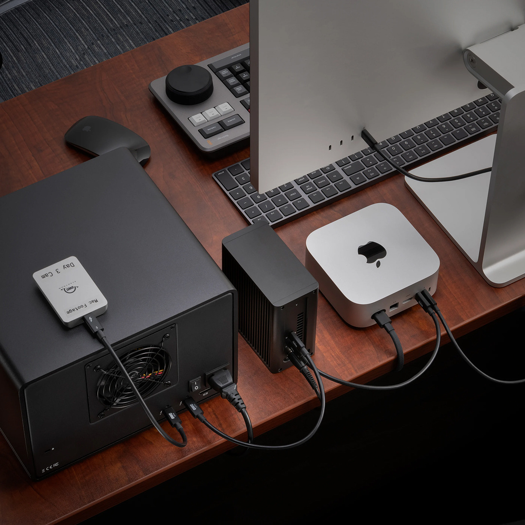 ダウンストリームのThunderbolt 5ポートを利用して、単一の超大容量ボリュームとしてドライブを結合した別のExpress 4M2 Ultraエンクロージャーを含め、最大5台のThunderboltデバイスをデイジーチェーン接続することが可能です。