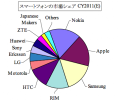 スマートフォン市場シェアではNokiaが首位ですが、シェアを落としていて、Apple、サムソンがシェアを大幅に伸ばしているようです。
