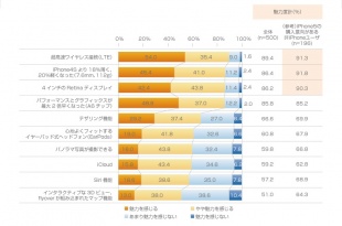 iPhone 5の特長についてどの程度魅力を感じているか尋ねたところ、「超高速ワイヤレス接続(LTE)」の魅力度(魅力を感じる+やや魅力を感じる)が89%で最も高く、次いで「iPhone4Sより18%薄く、20%軽くなった(7.6mm、112g)」「4インチのRetinaディスプレイ」が各々86%という結果だったと報告されています。