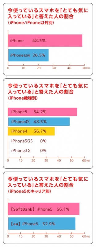 Softbank iPhone 5はiPhone 5の中でも「とても気に入っている」と回答した割合が高く、特に料金面が支持されていて、auのiPhoneは家族が利用していたり、使い慣れた会社であるといった点が大きく評価を得ていると分析されています。