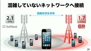 ソフトバンクモバイルの2.1GHz帯LTEと混雑状況を共有し、混んでいない方に繋がるという仕組みになるそうで、都内の一部地域から開始し、全国に順次拡大するそうです。
