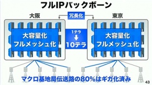 バックボーンも強化し、大阪と東京のバックボーンを大容量化とフルメッシュ化し、両方を10テラで接続するフルIPバックボーン化を実現していると説明しています。