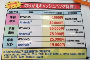 これにiPhone 5の新規購入(MNP)キャッシュバックが付き、学割学生が50,000円、学割家族が35,000円 x3人分で、合計155,000円となります。(学生が1人の場合)