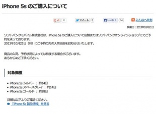 ソフトバンクモバイル、iPhone 5sの入荷目処について案内(iPhone 5s ゴールドは 約28日)