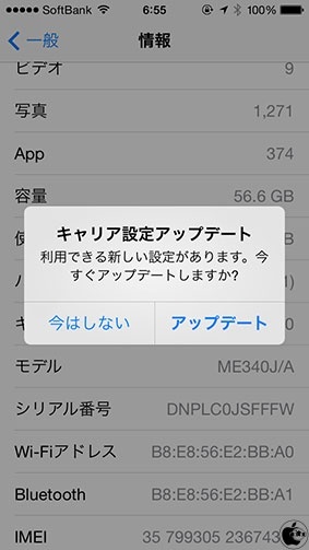 設定>一般>情報の順にタップし、利用可能なアップデートがある場合は、メッセージが表示されます。(iOS :キャリア設定をアップデートする)