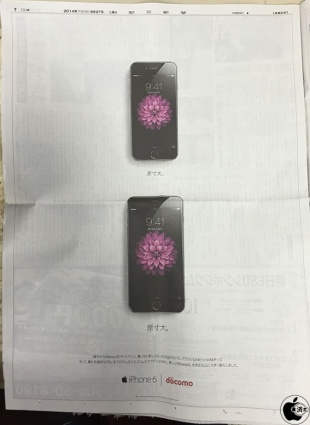 Appleが、各新聞に「iPhone 6」と「iPhone 6 Plus」の原寸大広告を掲載しています。