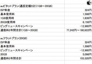 KDDIの本体代金と、1GB、5GB、旧プランの通話定額通信料は表の通りになります。