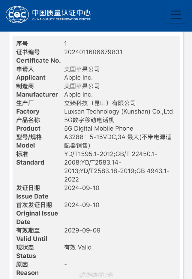 iPhone 16 モデル番号A3288、メーカー:Honfujing Precision Electronics(鄭州)、Futaihua Industry(深セン)、Lizhen Precision Manufacturing(昆山)