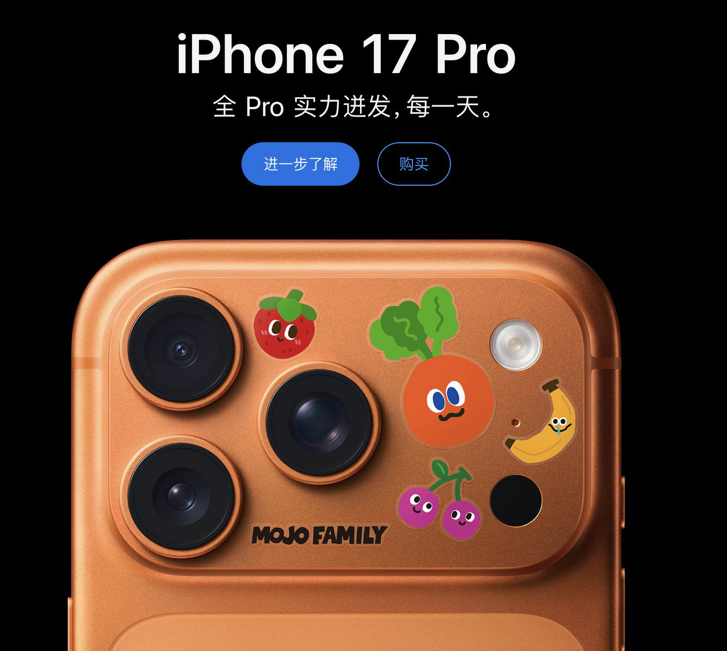 中国Appleが、iPhone 17 ProのプラトーにMOJO FAMILYシールを貼ったヒーロー画像「MOJO FAMILY痛版」を掲示しています。