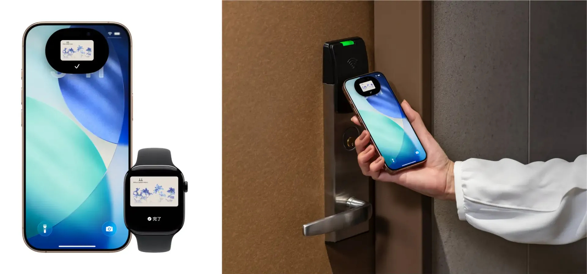 Appleウォレットのルームキーがあれば、ゲストがiPhoneやApple Watchをタップするだけで、ゲストルームはもちろん、ホテル内の共用スペースやエレベーターなど、ホテル内施設の解錠が可能になります。