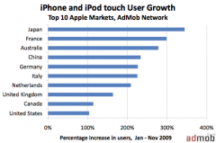 ユーザー拡大率は、日本が350%とトップとなり、今年、発売されたiPhone 3GSによって、かなりユーザー拡大につながったと予想されます。
