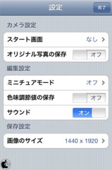 設定では、フォーカスの水平固定、色味調節値のプリセットを行うミニチュアモードのオン/オフや、画像サイズ選択、前回の色味調節値の保存などを設定することが出来ます。