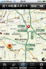 今いる場所から探すをタップすると、現在地情報を取得し、Yahoo!地図が表示され、現在地から近い紅葉スポットが表示されます。