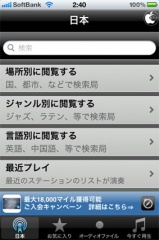 アプリを起動して、場所別検索、ジャンル検索、言語検索をタップして、好きなインターネットラジオ局を探します。