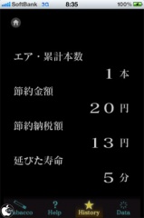エアタバコを吸った本数と、それによって節約出来た金額、節約納税額、延びた寿命などが表示されるようになっています。
