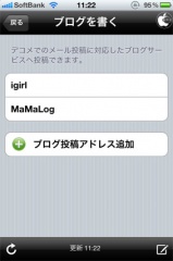 ブログ投稿をタップすると、女の子用携帯ブログサービス「iGirl★アイガール」や、ママ&マタママ用の無料ブログ「MaMaLog ママログ」が用意されていて、他のデコメ対応ケータイブログサービスを登録することも出来ます。