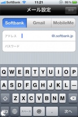 最初に、@i.softbank.jpか、Gmail、MobileMeアカウント情報を設定します。