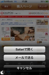 右下にある四角ボタンをタップすると、Safariで開いたり、クーポンのタイトルとURLが入力されたメールを送信することが出来ます。