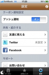 設定では、TwitterやFacebookアカウントを入力すると、クーポン情報を投稿することが出来るようになります。