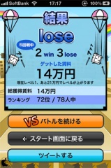 5回戦が終了すると、バトル結果が表示され、戦いに勝利すると相手の「マドリ」の賃料を獲得できます。