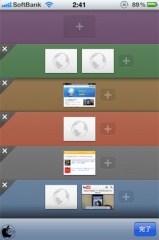 右下のボタンをタップすると、タブをグループ分けする画面が表示され、色分けされたグループ間で、タブをドラッグして管理することが出来ます。